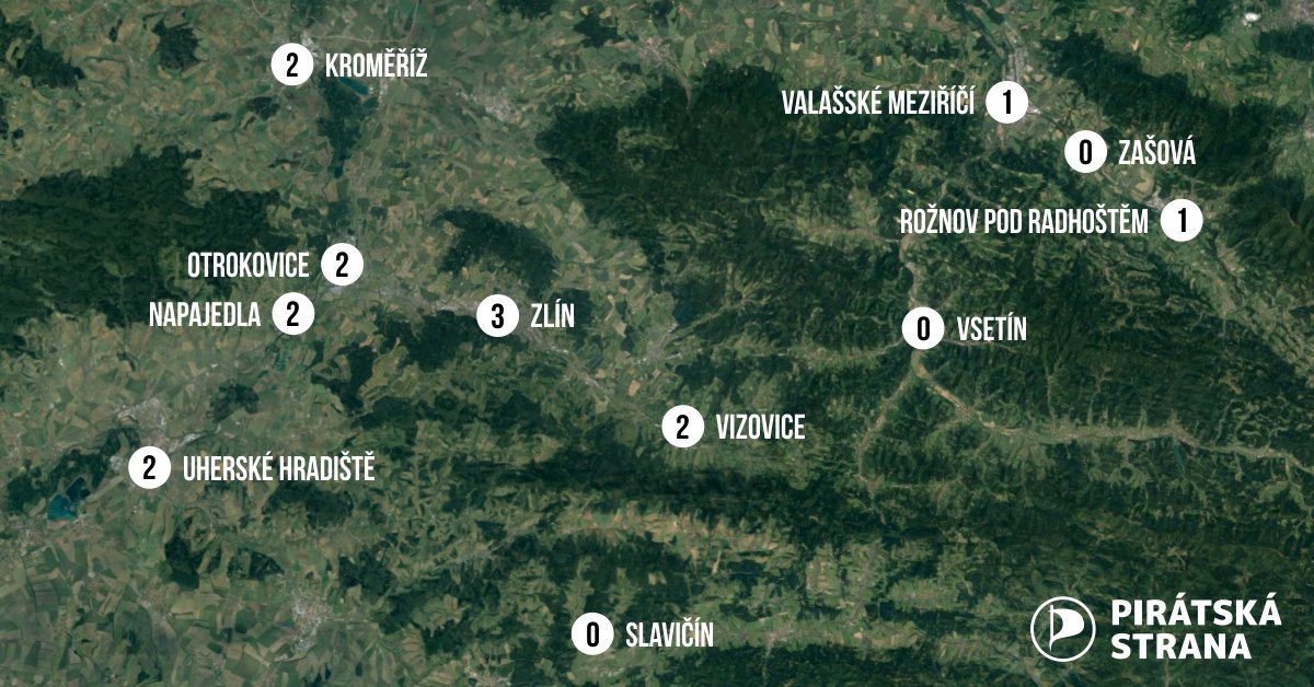 Celkem v osmi městech a jedné vesnici ve Zlínském kraji se podařilo Pirátům protlačit do obecního zastupitelstva minimálně jednoho člena. Patnáct městských zastupitelů pochází přímo z pirátských kandidátek či z kandidátů s naší podporou, ve Stupavě získal jeden Pirát mandát mezi nezávislými. Neuspěly pouze pirátské kandidátky na Vsetíně, v Zašové a ve Slavičíně.